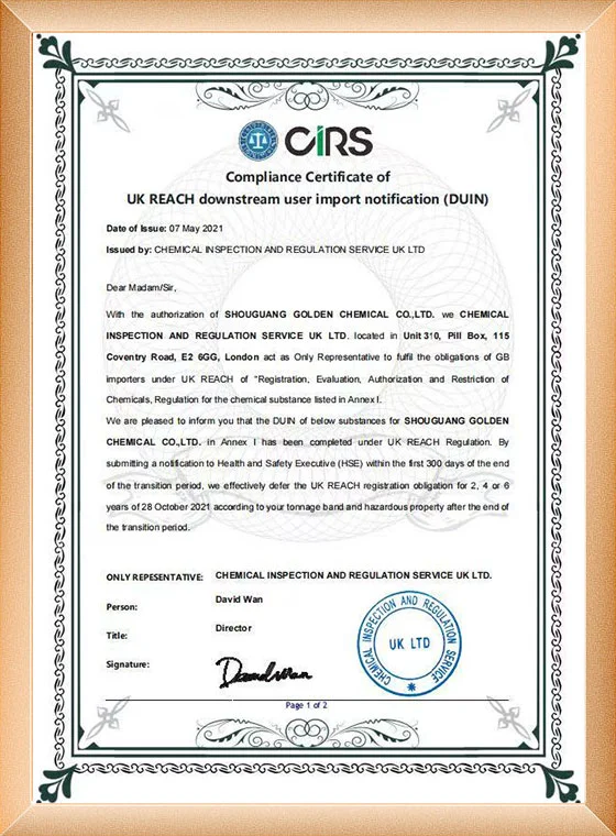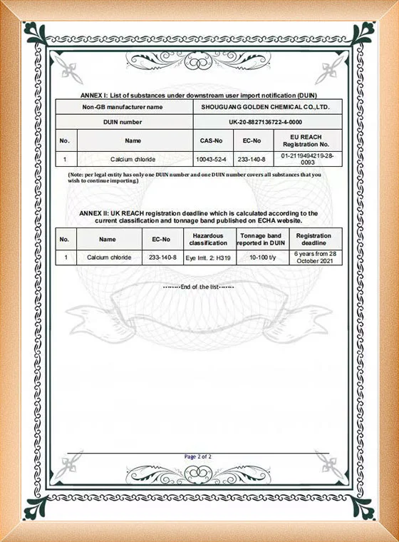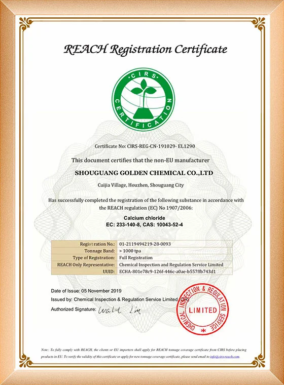 ເນື່ອງຈາກຄວາມຕ້ອງການ Calcium Chloride ເພີ່ມຂຶ້ນຈາກລູກຄ້າ EU, ແລະມີທັດສະນະຄະຕິຂອງການບໍລິການທີ່ມີຄຸນນະພາບສູງໃຫ້ແກ່ລູກຄ້າ, ບໍລິສັດຂອງພວກເຮົາໄດ້ສະຫມັກແລະໄດ້ຮັບການຢັ້ງຢືນ REACH ໃນປີ 2019.
