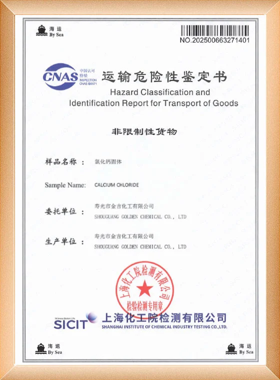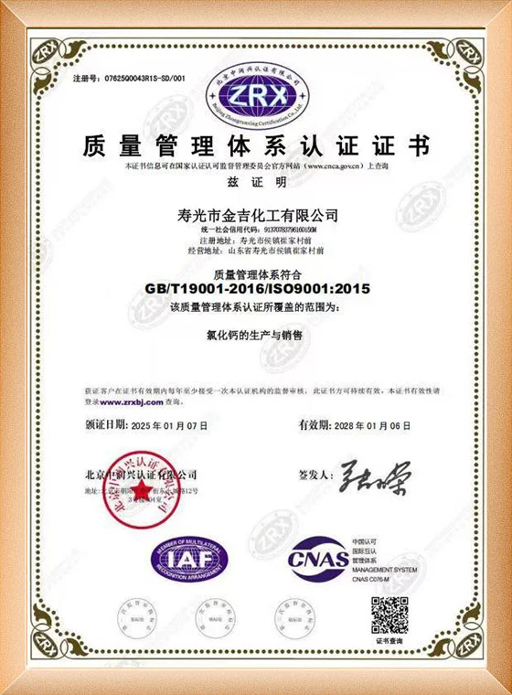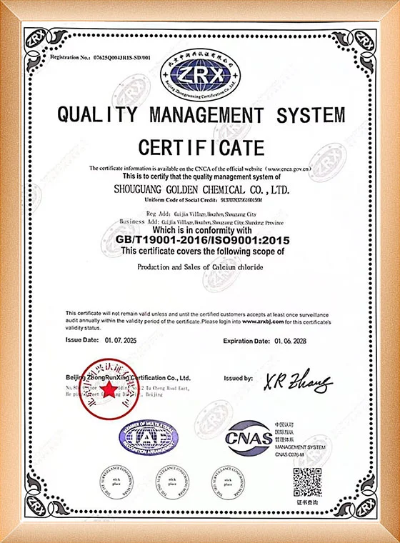 ໃນປີ 2015, ການຄຸ້ມຄອງຄຸນນະພາບຂອງຜະລິດຕະພັນດ້ວຍທາດການຊຽມ chloride ໄດ້ຜ່ານການຢັ້ງຢືນລະບົບການຄຸ້ມຄອງຄຸນນະພາບ ISO9001-2008, ແລະໃນປີ 2019, ໄດ້ຮັບໃບຢັ້ງຢືນ REACH ຂອງສະຫະພາບເອີຣົບ.